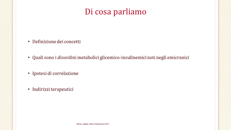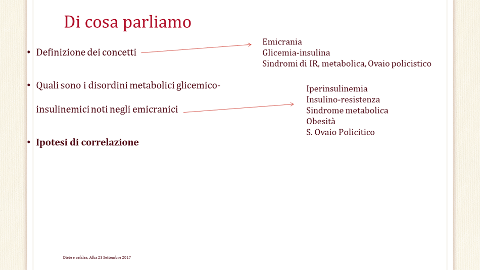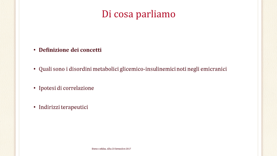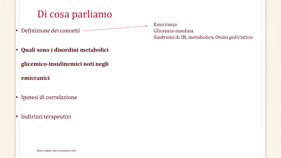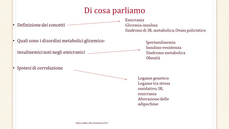 In questa trattazione affronteremo i seguenti argomenti; definiremo alcuni concetti di base per poter comprendere gli argomenti successivi; descriveremo quali sono i disordini metabolici glicemico-insulinemici ad oggi noti negli emicranici; quali le ipotesi di correlazione tra queste alterazioni e l’emicrania; quali gli indirizzi terapeutici.