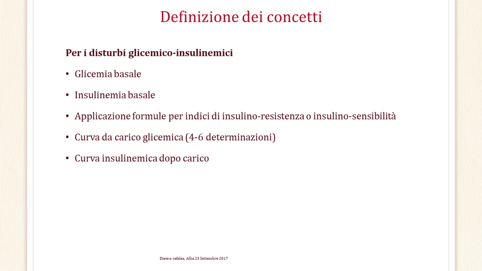 Trattando dei disturbi glicemico-insulinemici si parlerà di glicemia basale, Insulinemia basale, dell’applicazione formule per indici di insulino-resistenza o insulino-sensibilità, delle curve da carico glicemica (4-6 determinazioni) e insulinemica dopo carico.