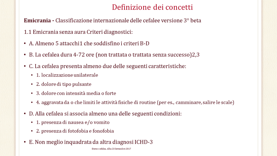 Abbiamo già più volte eviscerato la definizione di emicrania, che si trova in modo approfondito nel sito. In sintesi per definire l’emicrania il paziente deve aver avuto almeno 5 attacchi che rispettino i criteri classificativi, ossia con dolore di durata di 4-72 ore, con caratteristiche unilaterale e/o pulsante e/o di intensità medio-grave, e/o aggravato da o che limiti le attività fisiche di routine; devono coesistere nausea e/o vomito, fono e fotofobia. Non meglio inquadrata da altra diagnosi della classificazione internazionale delle cefalea.
