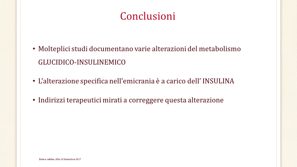 In conclusione, molteplici studi documentano varie alterazioni del metabolismo GLUCIDICO-INSULINEMICO, l’alterazione specifica nell’emicrania è a carico dell’ INSULINA, sulla base di queste informazioni si sono sviluppati alcuni indirizzi terapeutici mirati a correggere questa alterazione con lo scopo di curare l’emicrania.