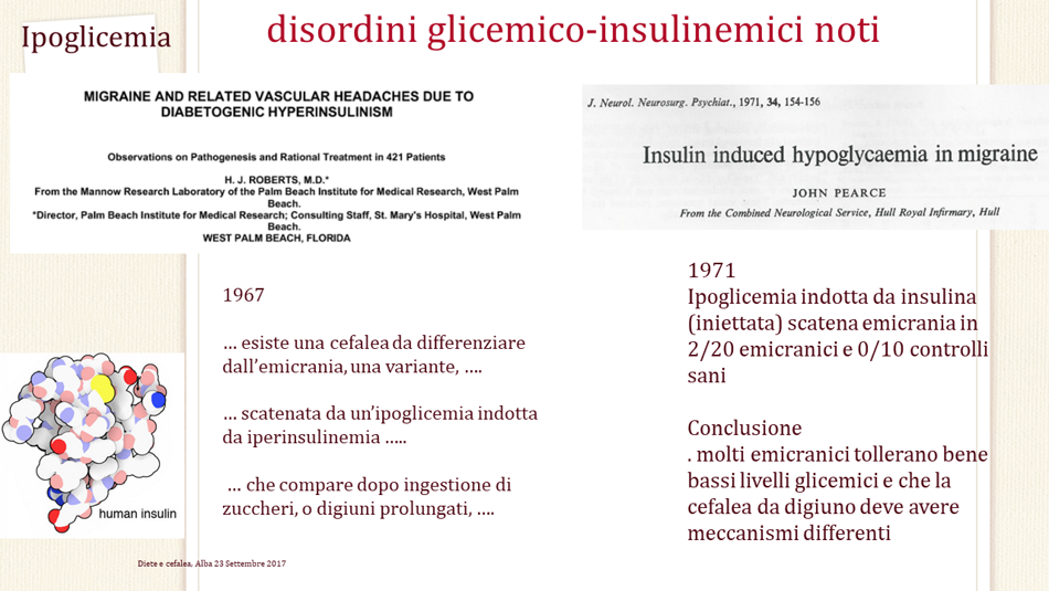 La prima attenzione sui disordini metabolici glicemico-insulinemici negli emicranici vertiva sull’ipoglicemia. Nel suo articolo del 1967 il Dr Roberts raccontava … <<esiste una cefalea da differenziare dall’emicrania, una variante, …. scatenata da un’ipoglicemia indotta da iperinsulinemia ….., … che compare dopo ingestione di zuccheri, o digiuni prolungati, …..>>. Pochi anni dopo, nel 1971, Jhon Pearce metteva l' accento che il problema della cefalea da digiuno non fosse dovuta all’ ipoglicemia, infatti la ipoglicemia indotta da iniezione di insulina non compariva nei soggetti di controllo e compariva solo in due emicranici. La conclusione era che molti emicranici tollerano bene bassi livelli glicemici e che la cefalea da digiuno deve avere meccanismi differenti.