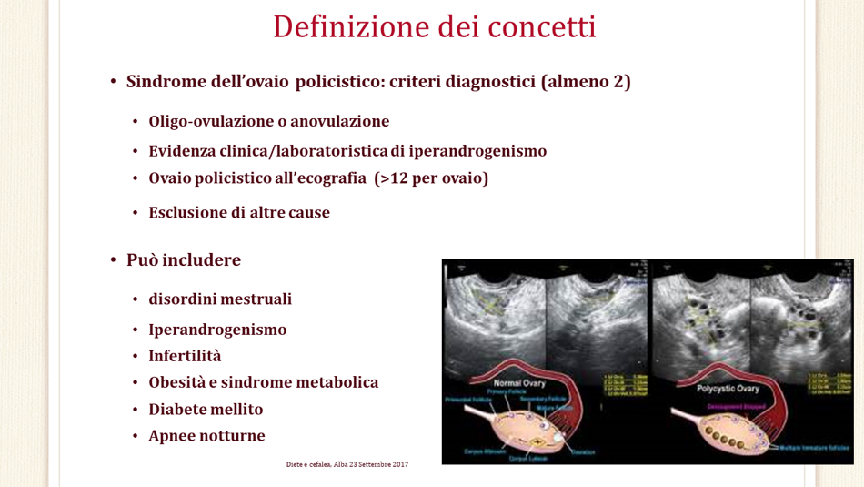 Essa riguarda fondamentalmente una disfunzione estrogenica, che si realizza tramite una difunzione degli ormoni sessuali ipofisari e alla cui base sta l’insulino-resistenza. I marcatori ormonali principali sono alti livelli di FSH /LH, DHEAs. Sia gli estrogeni che l’insulina devono essere degradati a livello epatico, tramite un unico passaggio; dato che l’insulina ha la precedenza nei confronti dell’estrogeno, un livello elevato di insulina induce di riflesso un accumulo estrogenico e una serue di successive interazioni a ritroso su quell’asse ormonale. Anche se la definizione contiene le parole ovario policistico, le cisti ovariche in realtà non sono la norma, e si ritrovano in circa la metà delle donne affette da questa sindrome. Diverse società scientifiche internazionali hanno definito la sindrome, i seguenti sono criteri che accomunano le varie definizioni.