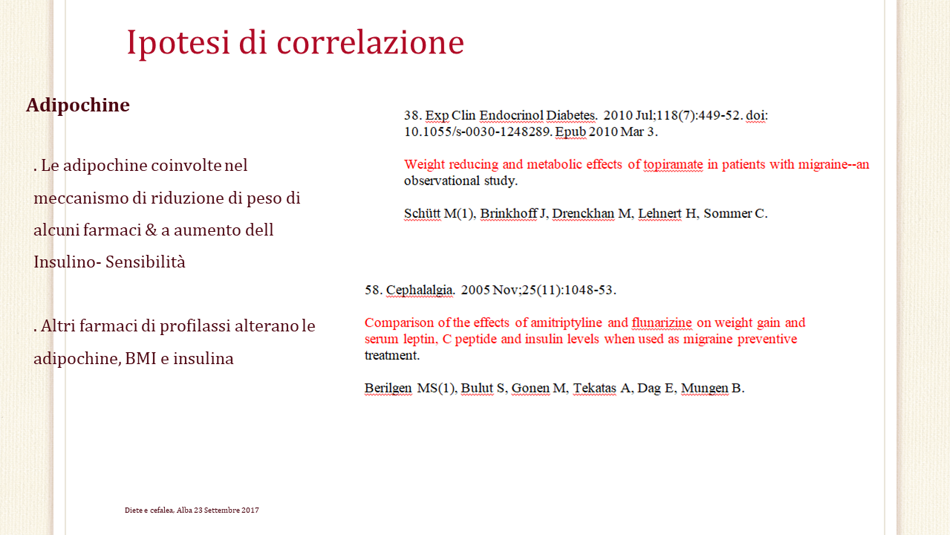 Le adipochine coinvolte nel meccanismo di riduzione di peso di alcuni farmaci utilizzati nella profilassi degli emicranici, associato a aumento dell’ Insulino- Sensibilità, e il topiramato ne è un esempio. Al contrario, altri farmaci di profilassi, come amitriptilina e flunarizina, alterano le adipochine, BMI e insulina.