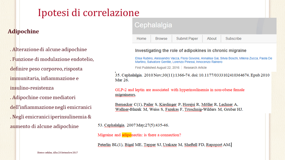 Le Adipochine possono intendersi come mediatori dell’infiammazione negli emicranici. Negli emicranici l’ iperinsulinemia si associa all’ aumento di alcune adipochine.