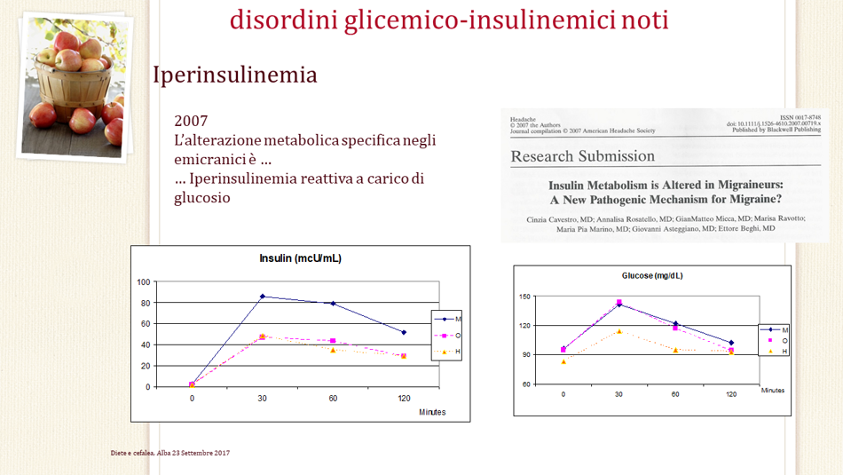 Dobbiamo arrivare al 2007 per evidenziare che l’alterazione specifica negli emicranici è l’iperinsulinemia. Nel nostro studio avevamo studiato 3 gruppi di persone: un gruppo affetto da emicrania; uno da altri tipi di cefalee e che doveva avere la funzione di gruppo di controllo che soffrisse di dolore al capo analogamente all’ emicrania, ma di altra origine; un terzo gruppo di volontari sani. Tutte le persone coinvolte aveva effettuato la curva da carico glicemica e insulinemica. Coloro che soffrivano di cefalea avevano dei valori di glicemia superiori ai sani, ma solo gli emicranici avevano valori di insulina elevati.