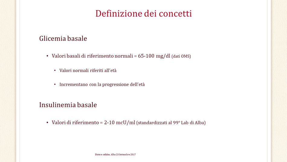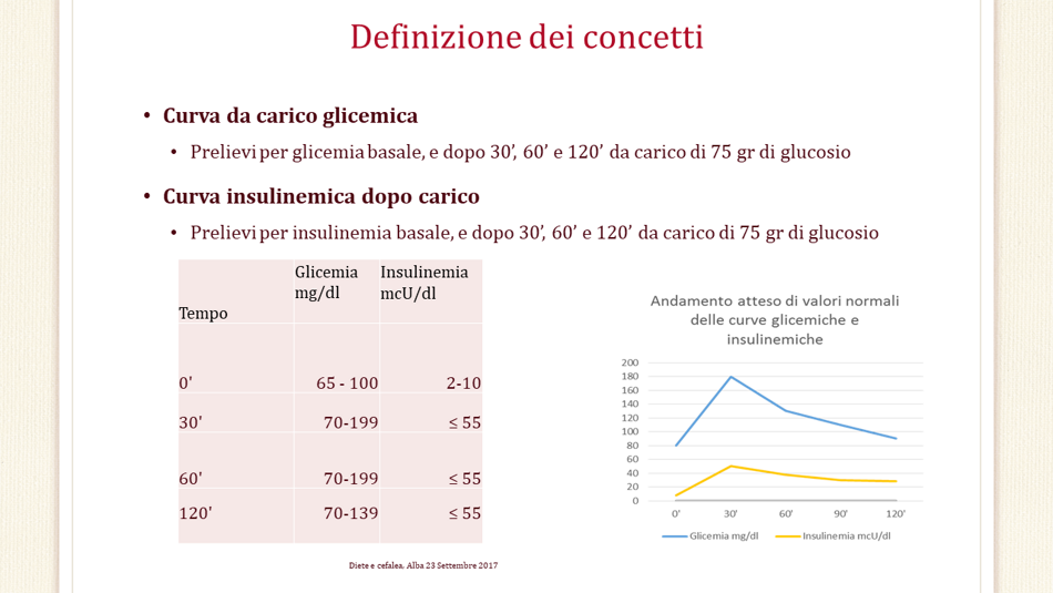Insulinemia basale ha riferimenti vari. In loco abbiamo standardizzato i valori normativi dell’insulinemia basale nel 2004, e sono valori compresi tra 2 e 10 10 mcU/ml (standardizzati al 99° Lab di Alba).