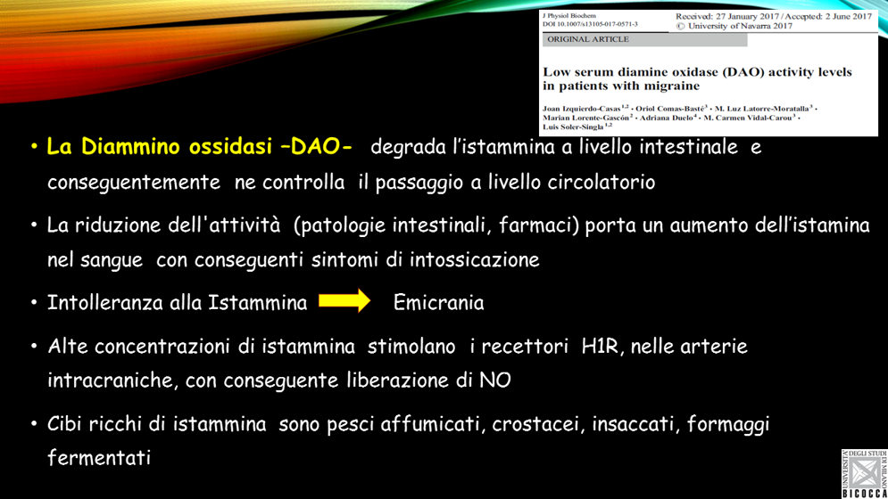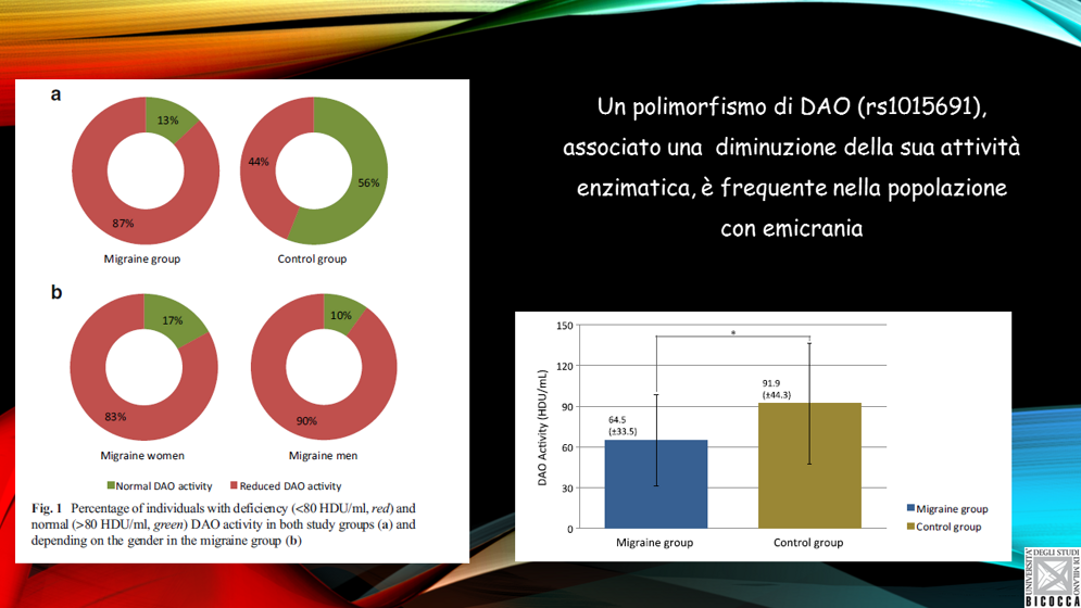 Infatti, recentemente Izquierdo-Casa e collaboratori (J. Pysiol. Biochem, 2017) hanno dimostrato che in un gruppo di persone con emicrania, l’attività della DAO è più bassa rispetto a persone che non soffrono di emicrania e che un polimorfismo di DAO (rs1015691), associato una diminuzione della sua attività enzimatica, è frequente nella popolazione con emicrania.