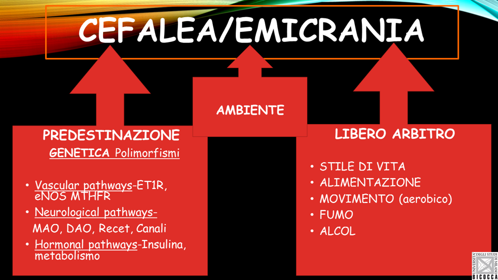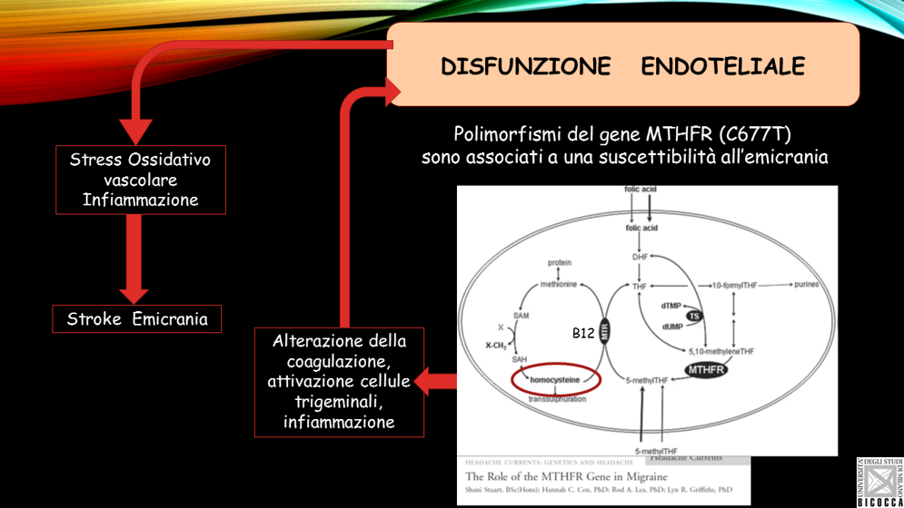 Nelle persone suscettibili alla emicrania è frequente un particolare polimorfismo del gene MTHFR (C677T) che codifica per un enzima (metilen-tetraidrofolato reduttasi) essenziale nel ciclo dei folati, in particolare per la conversione dell’omocisteina in metionina. La bassa efficienza di questo enzima comporta un aumento di omocisteina a livello circolatorio. E’ noto che l’aumento di quest’ultima molecola induce alterazione della coagulazione, attivazione cellule trigeminali, infiammazione e di conseguenza disfunzione endoteliale.