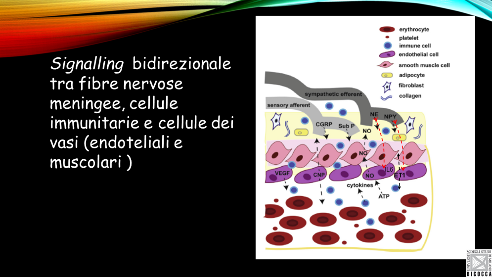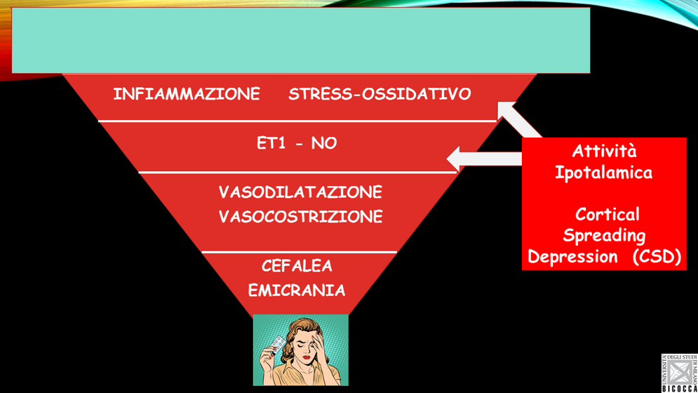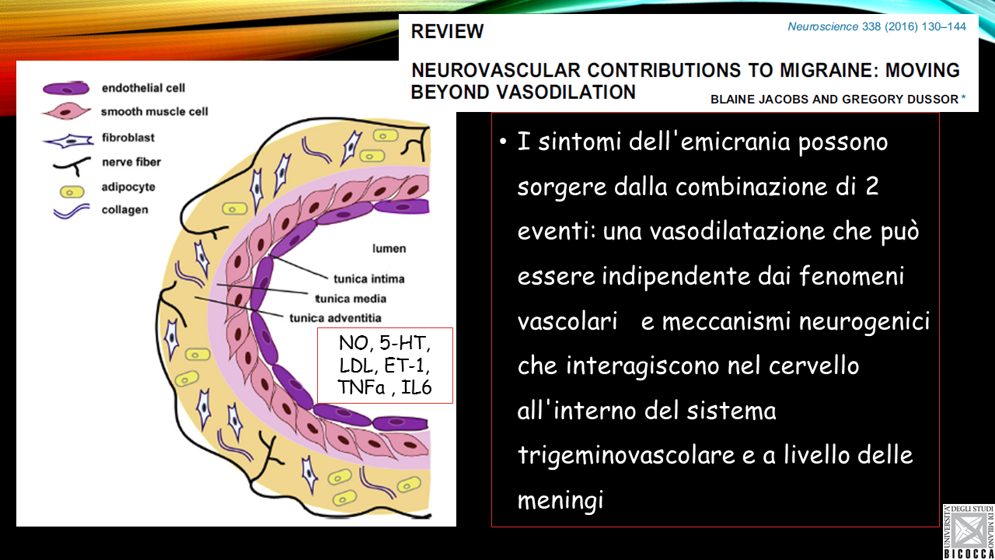 Nello stesso tempo, il rilascio di mediatori pro-infiammatori, prodotti dal reclutamento delle cellule immunitarie, può amplificare la sensibilizzazione delle vie afferenti meningiali. Quindi, la vasodilatazione può essere un fenomeno che nasconde pathway di signalling, mediati dalle cellule endoteliali, che contribuiscono alla sensibilizzazione delle vie afferenti meningiali e il dolore emicranico (Jacobs and Dussor, Neuroscience, 2016) e che inducono infiammazione e stress ossidativo, autoalimentano il circolo vizioso.