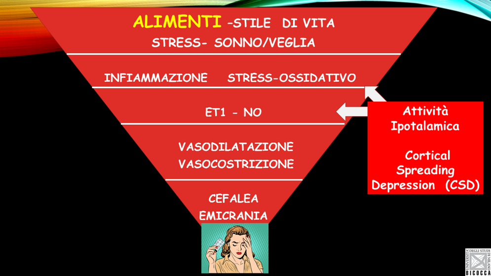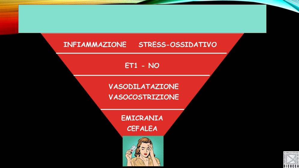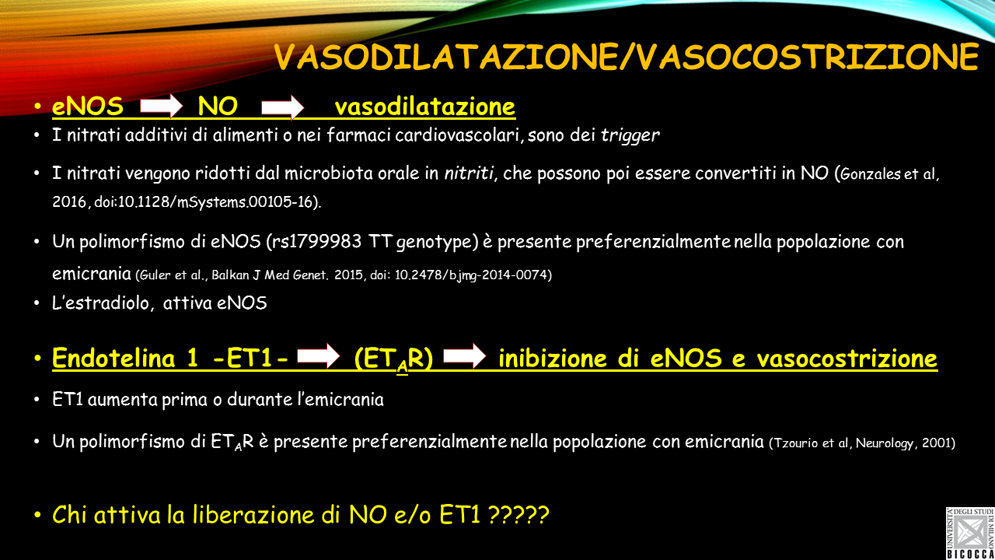 Diverse sono le evidenze sperimentali che supportano il coinvolgimento di NO, come molecola vasodilatatrice nelle emicranie. Infatti, è noto che: a) i nitrati usati come additivi negli alimenti o nei farmaci nitroderivati utilizzati nelle patologie cardiovascolari, sono dei trigger per l’emicrania; b) nelle persone con frequenti attacchi di emicrania, sono maggiormente presenti nel macribiota della bocca, batteri nitrati-riduttori che riducono i nitrati in nitriti, che successivamente vengono convertiti in NO (Gonzales et al., 2016 doi:10.1128/mSystems.00105-16); c) un polimorfismo di eNOS (rs1799983 TT) è presente preferenzialmente nella popolazione con emicrania ed è un fattore di rischio per gravità e durata della cefalea (Guler et al., 2015, Balkan J Med Genet. doi: 10.2478/bjmg-2014-0074); d) nelle donne gli attacchi di emicrania sono legati al ciclo mestruale e l’estradiolo è un attivatore di eNOS.