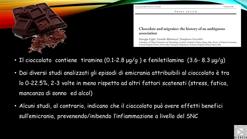 Per quanto riguarda il cioccolato, dai diversi studi analizzati, gli episodi di emicrania attribuibili al suo consumo è tra lo 0-22.5%, 2-3 volte in meno rispetto ad altri fattori scatenati (stress, fatica, mancanza di sonno ed alcol) e la causa è riconducibile a due molecole la tiramina (0.1-2.8 μg/g) e la feniletilamina (3.6- 8.3 μg/g). Di contro, altri studi suggeriscono che il cioccolato può avere effetti benefici sull’emicrania, in quanto le molecole antiossidanti presenti (ricordo che il cioccolato nero è uno degli alimenti a più alto ORAC -Oxygen Radical Absorbance Capacity-) preverrebbero l’infiammazione a livello cerebrale (Lippi et al., 2014 Acta Biomed).