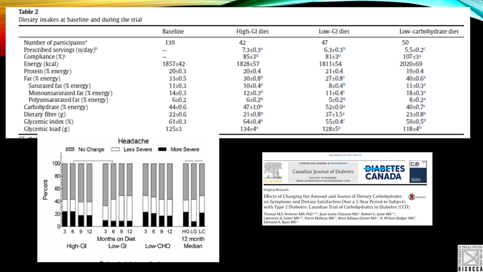 Wolever e collaboratori (Can J Diabetes, 2017) studiando l’effetto a lungo termine di una dieta a basso IG rispetto ad dieta ad alto IG su gruppi di persone diabetiche, hanno visto che tra gli effetti di una dieta a basso IG c’era una diminuzione del grado di severità di emicrania.