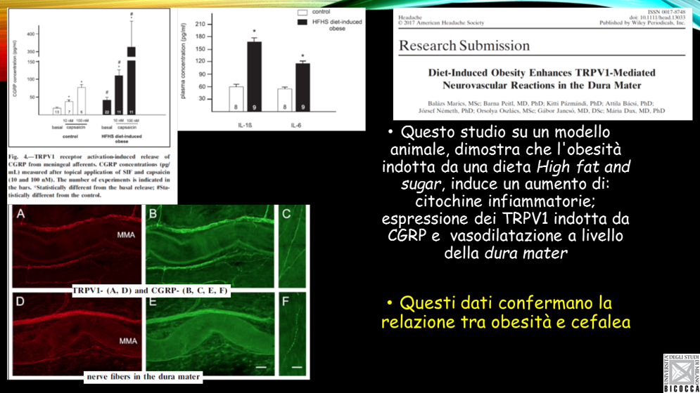Recentemente Marics e collaboratori (Headache, 2017) utilizzando un modello animale, hanno dimostrato che l’obesità indotta da una dieta High fat and sugar, induce un aumento di citochine infiammatorie, di espressione di TRPV1 indotta da CGRP e vasodilatazione a livello della dura mater.