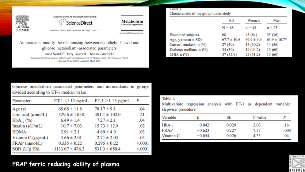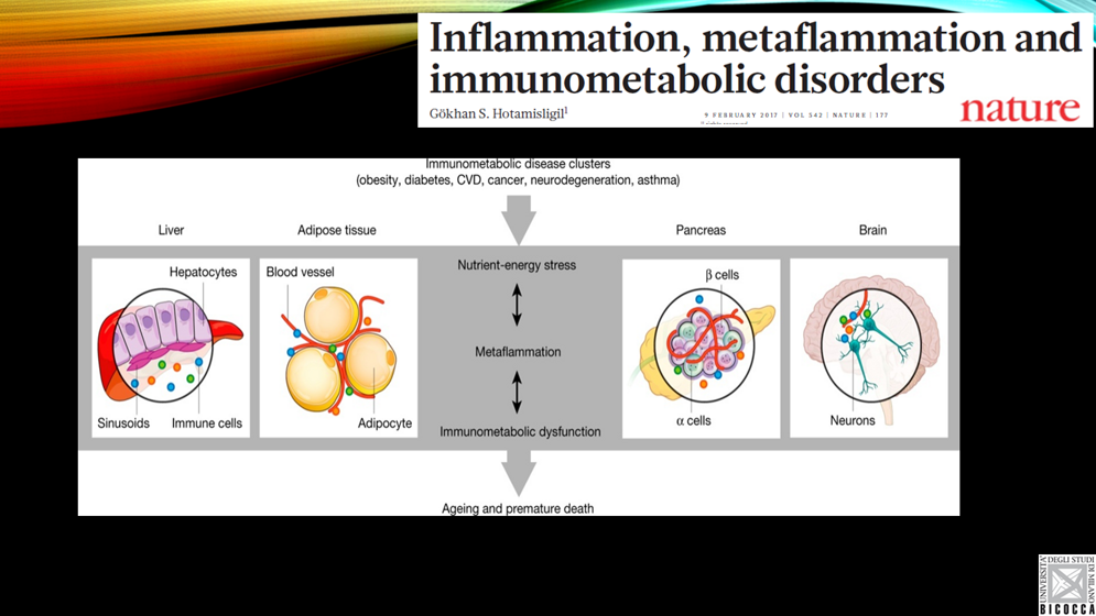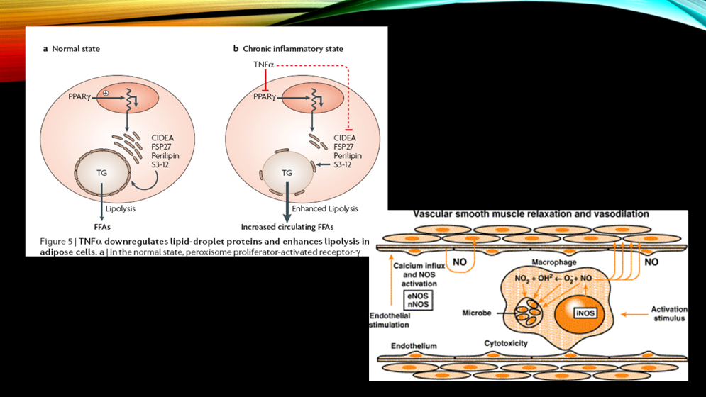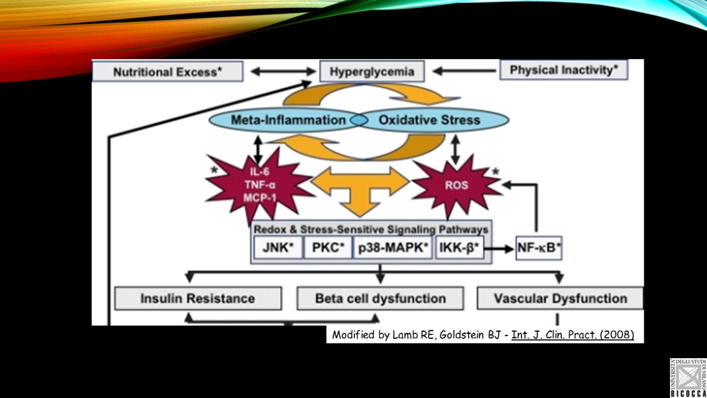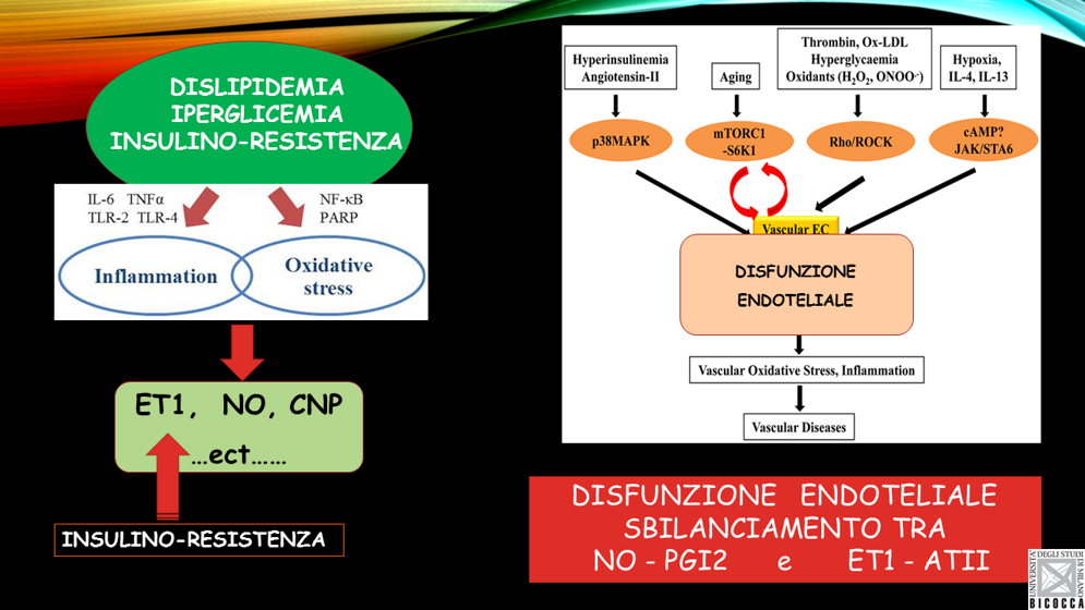 In conclusione, possiamo dire che le condizioni di iperglicemia, dislipidemia e insulino- resistenza attivano, nei diversi organi, pathway cellulari di signalling con liberazione di TNFα, IL6 attivazione dei Toll-like receptor e di NRf2 che innescano uno stato infiammatorio e di stress ossidativo. Questa condizione può determinare una disfunzione endoteliale. Si ricorda che con questo termine si intende uno sbilanciamento tra fattori vasodilatatori (NO, PGI2) e vasocostrittori (ET1, ATII).