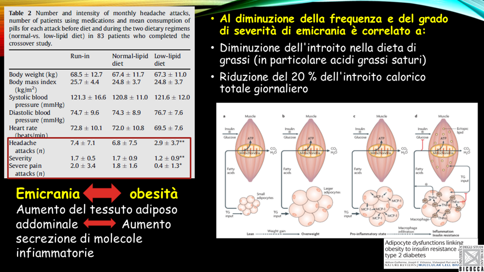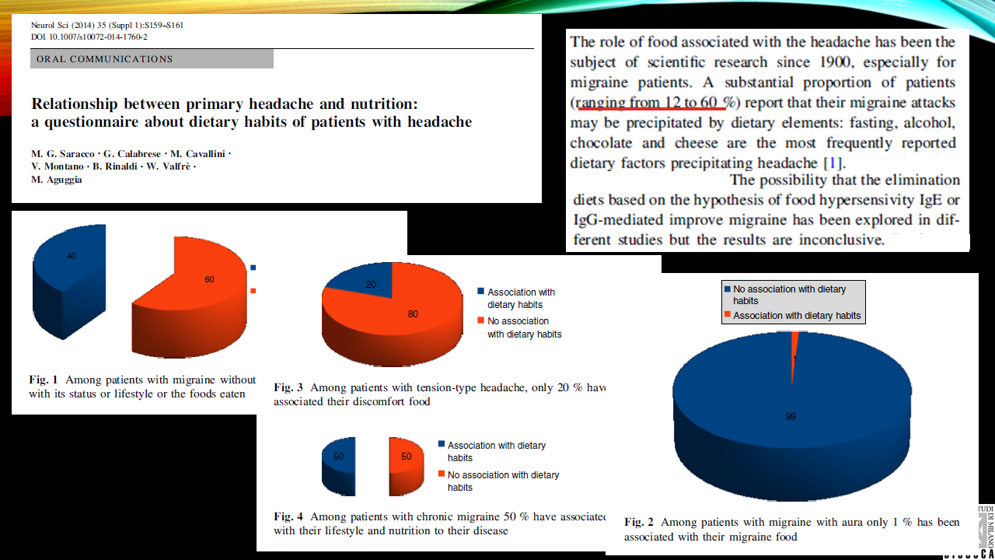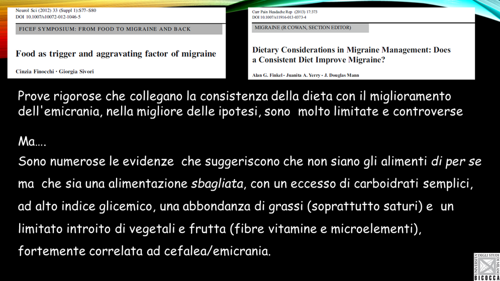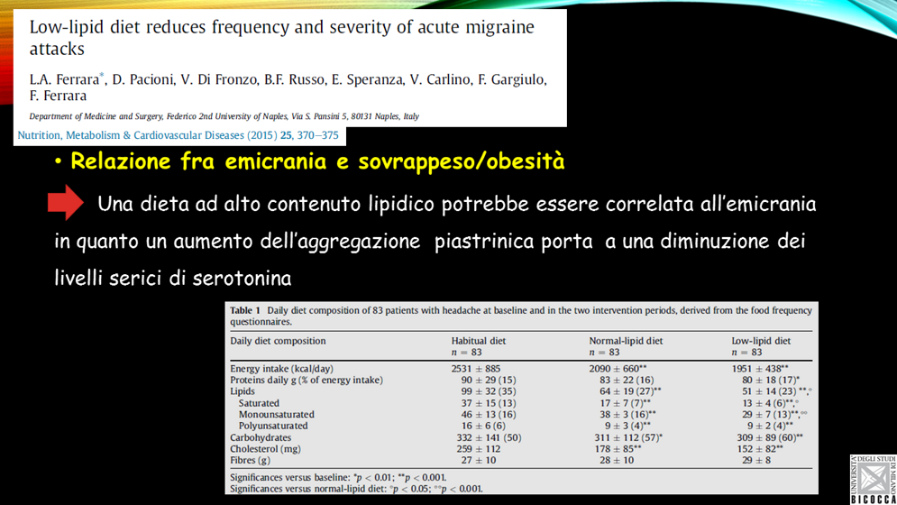 Tutto questi lavori sostengono l’ipotesi che è una dieta sbilanciata, con un eccesso di carboidrati semplici, ad alto indice glicemico, una abbondanza di grassi (soprattutto saturi) a correlare con cefalea/emicrania e che c’è una importante connessione con obesità ed emicrania.