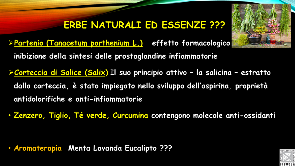 E gli altri metodi antichi con l’uso di erbe naturali? Anche loro in parte si perché contengono molecole antinfiammatorie (Tanacetum Parthenium e la corteccia del salice) o molecole anti-ossidanti (Zenzero, Tiglio, Tè verde, Curcumina).