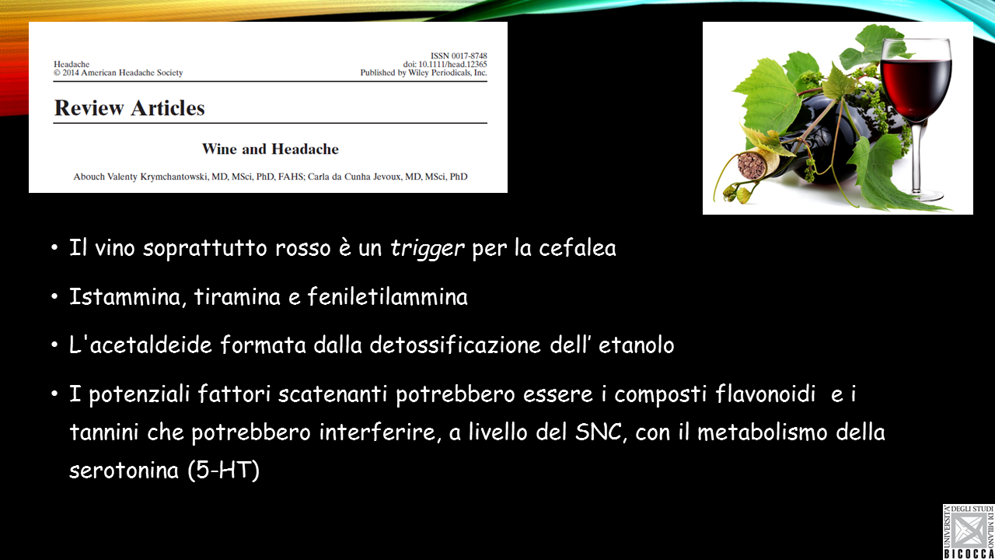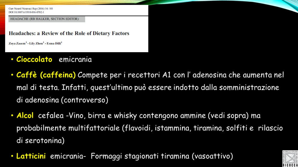 Una recente review riporta gli ultimi dati scientifici e studi riguardanti la correlazione tra cefalea e alimento e quale può esserne il motivo (Zaeem et al., 2016 Curr Neurol Neurosci Rep). In questa lista troviamo alcuni alimenti come il cioccolato, il caffe, le bibite alcoliche (vino) e i latticini.