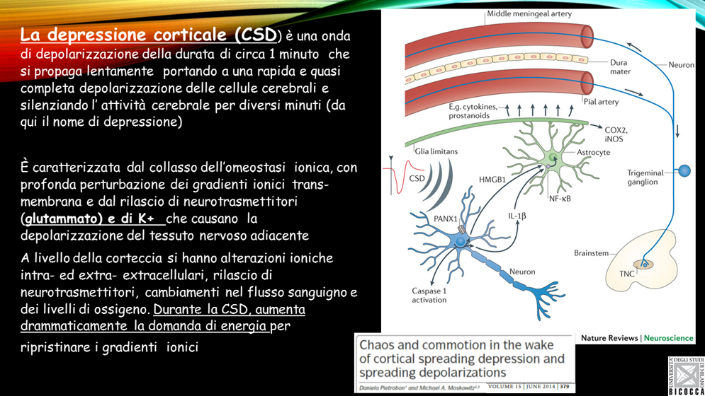 Le citochine e le prostaglandine, rilasciate dagli astrociti, raggiungono gli assoni sensoriali fino alle cellule trigeminali del ganglio. Da qui possono partire impulsi verso l’arteria meningiale centrale per promuovere una risposta infiammatoria neurogena indotta da CSD e la degranulazione dei mastociti all’interno delle meningi (Pietrobon and Moskowitz, 2014, Nature Rev).