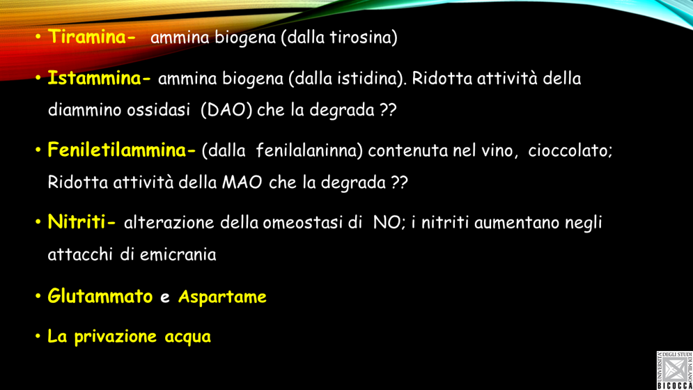 Un denominatore comune in molti alimenti è la presenza di particolari molecole come la tiramina, l’istammina, la feniletilammina che una volta introdotte devono essere velocemente catabolizzate. Nel caso dell’istammina, l’enzima deputato alla sua degradazione è la diammino ossidasi (DAO), enzima intestinale che ne controlla il suo passaggio a livello circolatorio. E’ noto che la riduzione dell’attività di DAO, dovuta a patologie intestinali o farmaci, porta un aumento dell’istamina nel sangue con conseguenti sintomi di intossicazione e che l’intolleranza all’istammina è correlata con l’emicrania.