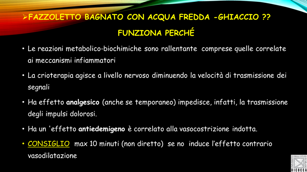 a) Le reazioni metabolico-biochimiche sono rallentante comprese quelle correlate ai meccanismi infiammatori; b) la crioterapia agisce a livello nervoso diminuendo la velocità di trasmissione dei segnali; c) ha effetto analgesico (anche se temporaneo) impedisce, infatti, la trasmissione degli impulsi dolorosi; d) ha un effetto anti-edemigeno è correlato alla vasocostrizione indotta.
