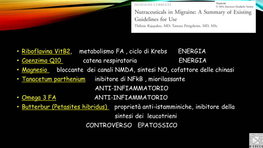 I nutraceutici inseriti in questa lista sono: la riboflavina e il coenzima Q (implicati nella produzione di energia), il magnesio (bloccante dei canali NMDA, regolatore delle chinasi e implicato nella sintesi di NO), gli acidi grassi omega-3 (antinfiammatori), il Tanacetum Parthenium (antinfiammatorio in quanto contiene molecole che inibiscono di NFkB, e miorilassante).