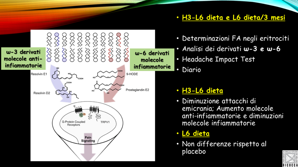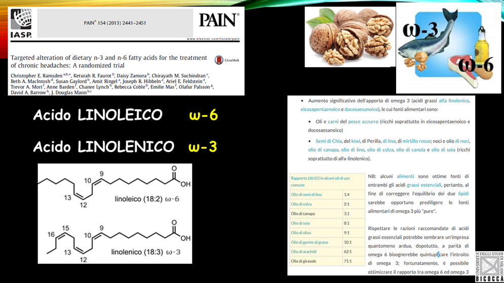 Ramsden e collaboratori (Pain, 2013), in un trial clinico randomizzato hanno dimostrato che un intervento dietetico che comportava aumento di acidi grassi omega-3 (precursori di molecole anti-infiammatorie) e una diminuzione di acidi grassi omega-6 (precursori di molecole infiammatorie) correlava ad una diminuzione di attacchi di emicrania.