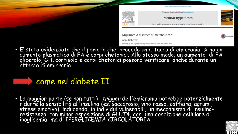 La maggior parte (se non tutti) i trigger dell’emicrania possono potenzialmente ridurre la sensibilità all’insulina (es. saccarosio, vino rosso, caffeina, agrumi, stress emotivo), inducendo, in individui vulnerabili, un meccanismo di insulino-resistenza, con minor esposizione dei recettori Glut4 che comporta una condizione cellulare di ipoglicemia ma di IPERGLICEMIA CIRCOLATORIA (Kokavec, 2016, Medical Hypotheses).