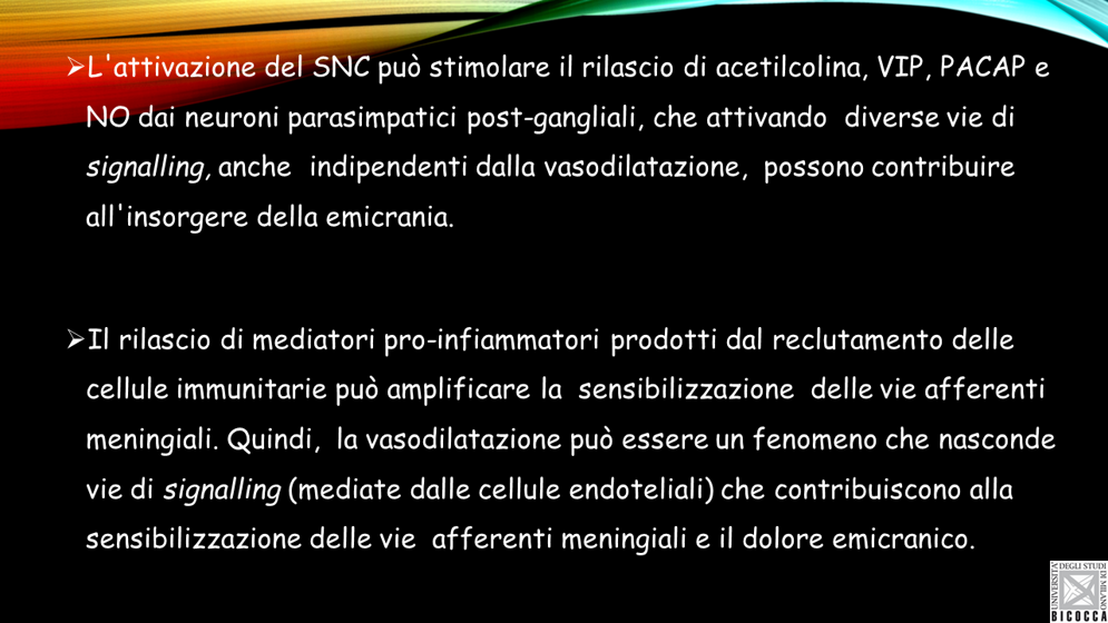 L’attivazione del SNC può stimolare il rilascio di acetilcolina, VIP, PACAP e NO dai neuroni parasimpatici post-gangliali, che attivando diversi pathway di signalling, anche indipendenti dalla vasodilatazione, possono contribuire all’insorgere della emicrania.