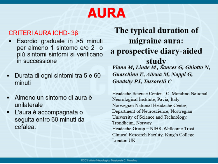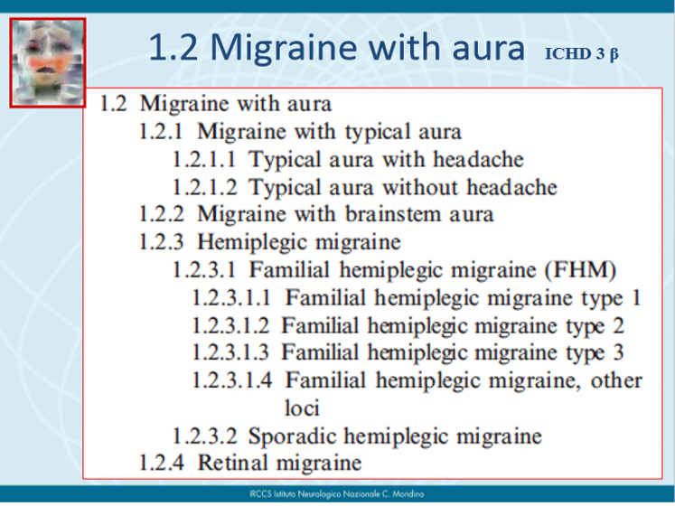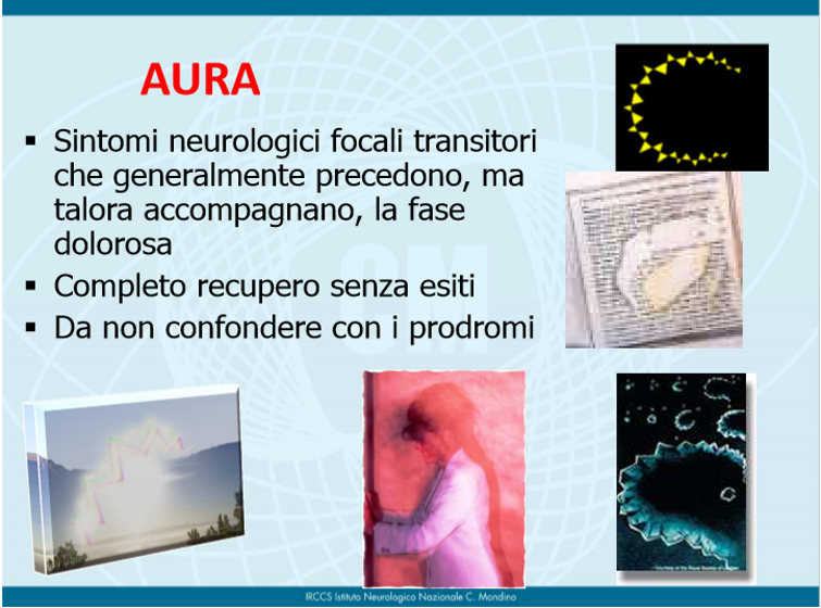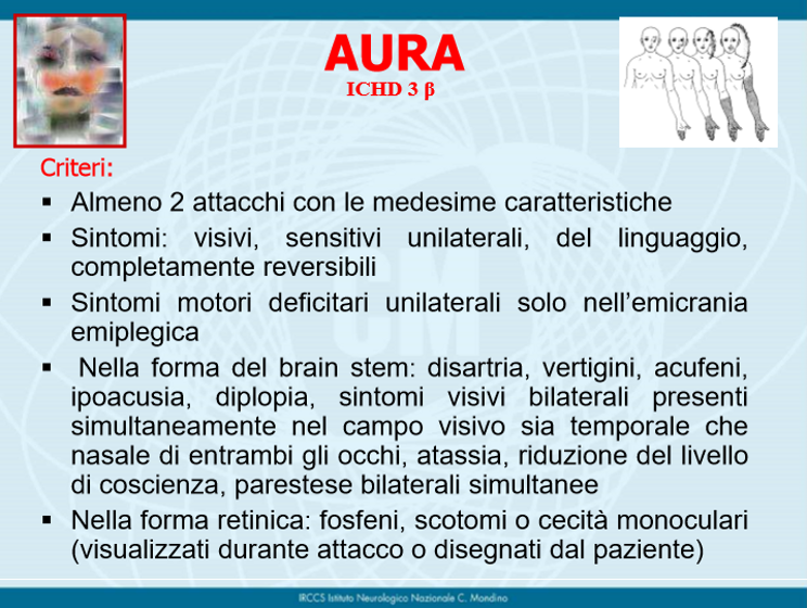 Entra quindi nel dettaglio sui criteri per la definizione dell'emicrania senz'aura, dell'emicrania con aura. Racconta poi in sintesi cosa si intende per aura e come vi siano diversi tipi di aura emicranica.