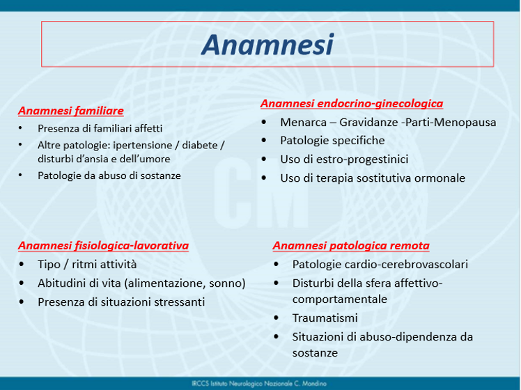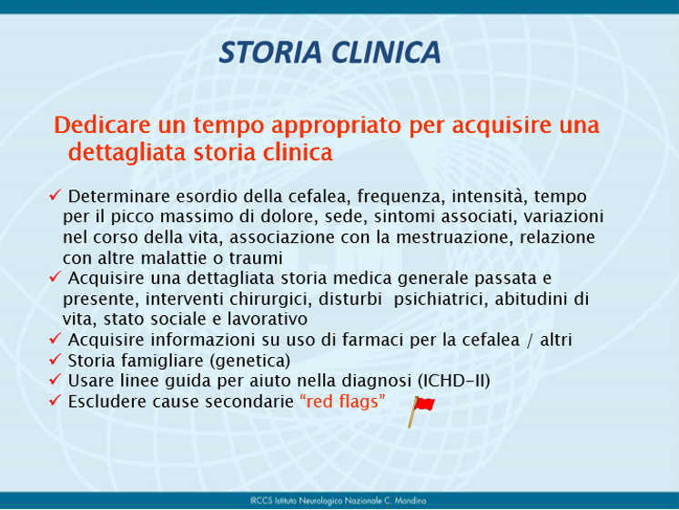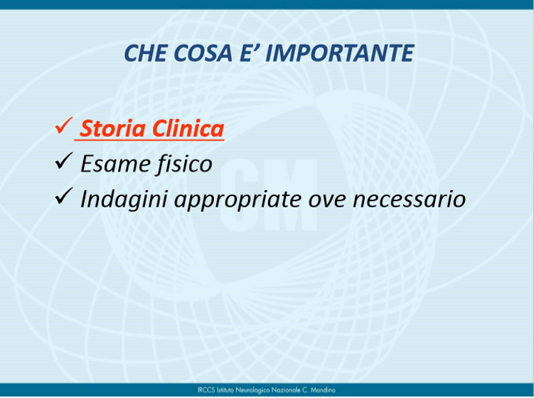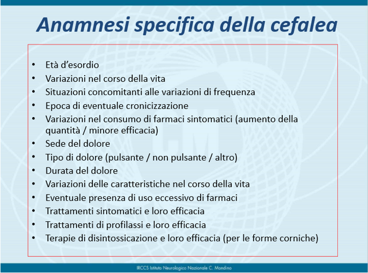 Ribadisce come per effettuare una diagnosi corretta siano fondamentali la storia clinica, l'esame fisico e eventuali indagini appropriate ove necessario. E' importante raccogliere dati relativi all'anamnesi familiare, fisiologico-lavorativa, endocrino-ginecologica, patologica remota, oltre ad una dettagliata anamnesi specifica sulla cefalea.