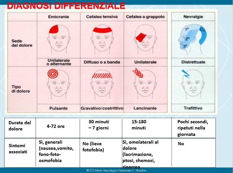 La diagnosi differenziale (DD) si pone sia nei confronti delle altre cefalee primarie, sia nei confronti delle cefalee secondarie.