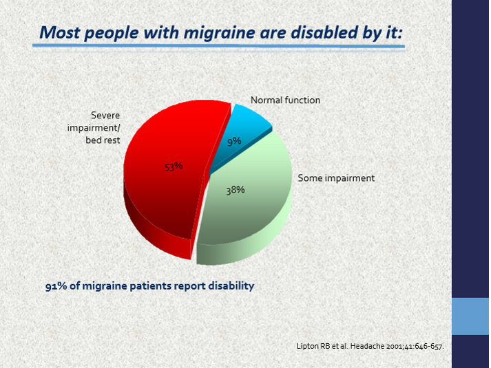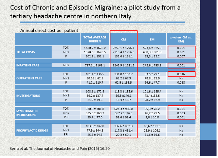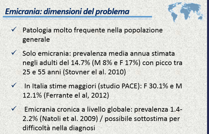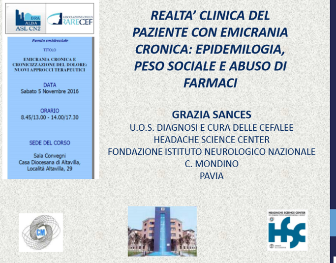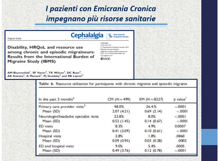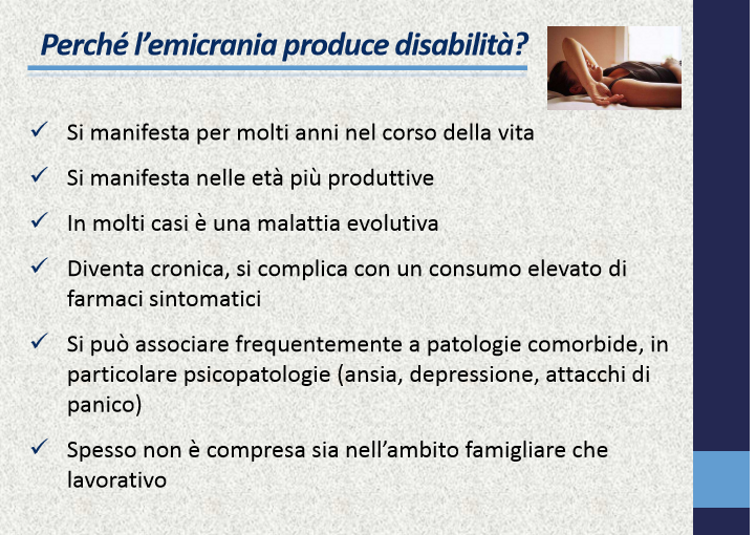 Nella presentazione che segue, la Dr.ssa Sances sottolinea i vari aspetti epidemiologici , gli aspetti legati alla disabilità dell'emicrania e altri sui costi che questa patologia comporta.