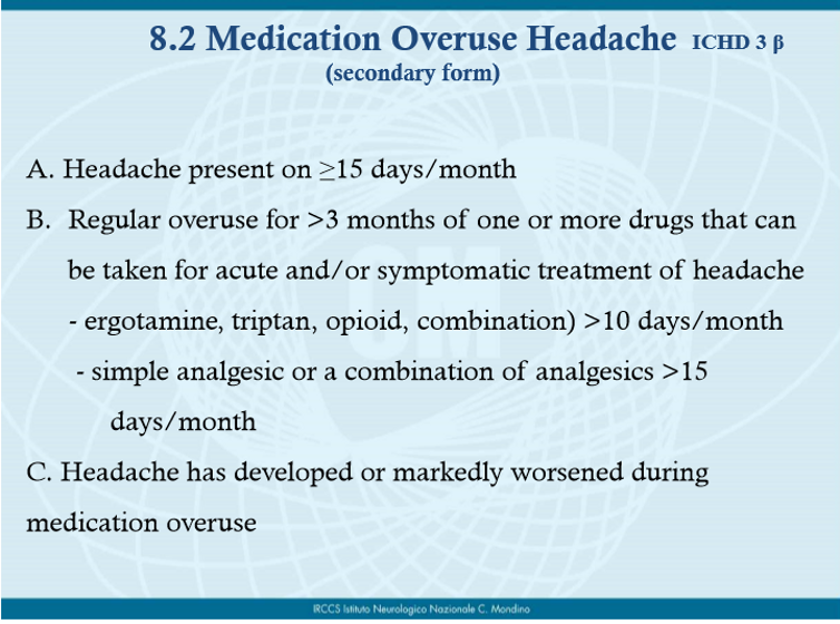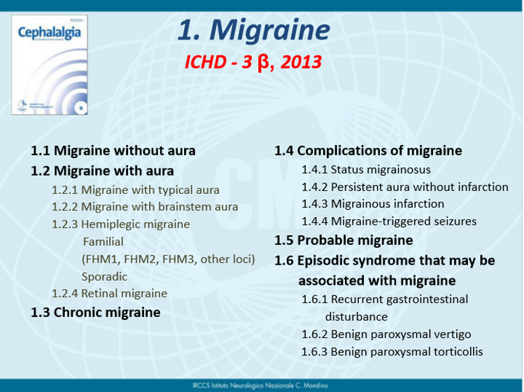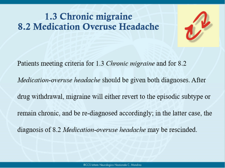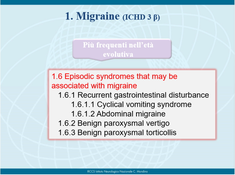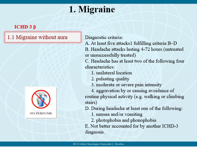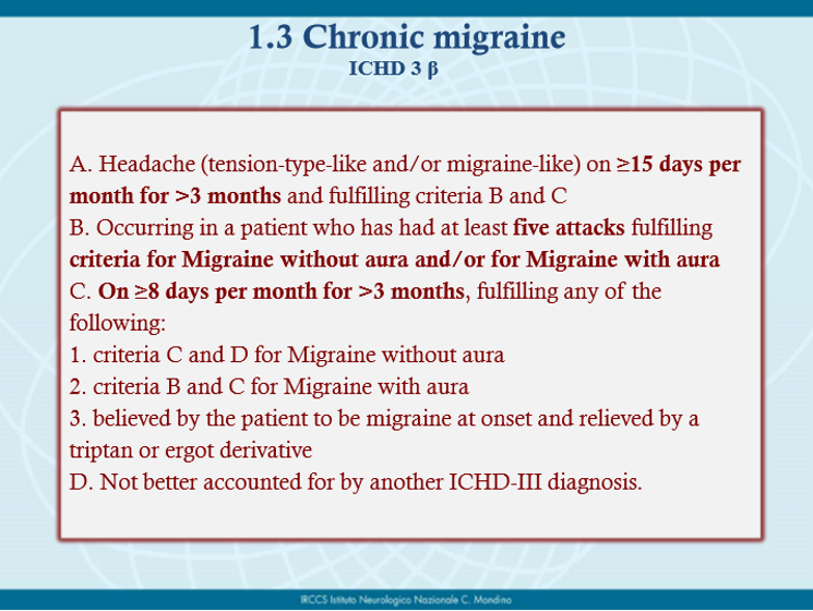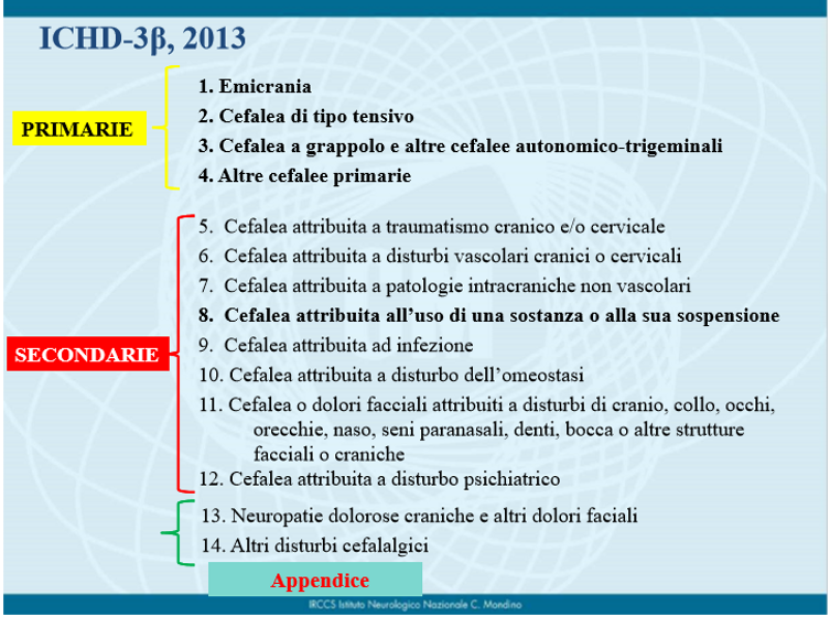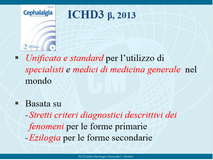 Riprende quindi i criteri diagnostici descritti nella classificazione internazionale delle cefalee, strumento fondamentale per una corretta diagnosi.