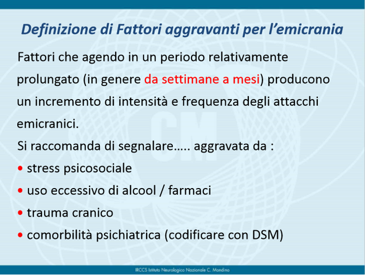 Esistono poi FATTORI AGGRAVANTI, ossia fattori che agendo in un periodo relativamente prolungato (in genere da settimane a mesi) producono un incremento di intensità e frequenza degli attacchi emicranici.