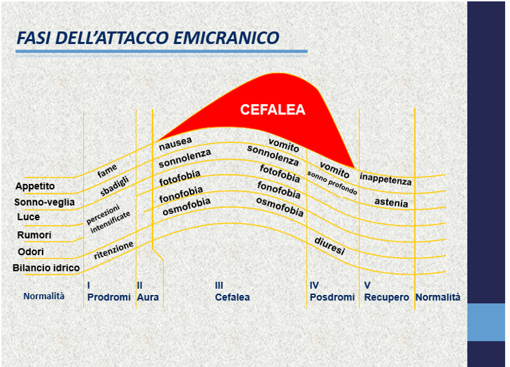Nausea, vomito, fotofobia (fastidio per la luce), fonofobia (fastidio per i rumori-suoni), fanno parte dei sintomi cardine di questo tipo di cefalea e sono quelli che sono essenziali per fare la diagnosi di emicrania.