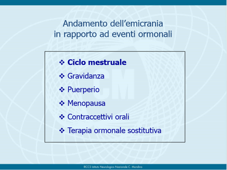 Diversi sono i fattori scatenanti e i fattori che contribuiscono alla gravità dell'emicrania. In particolare descrive alcuni aspetti peculiari nella donna.