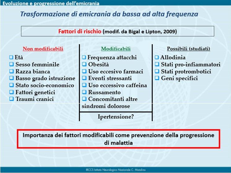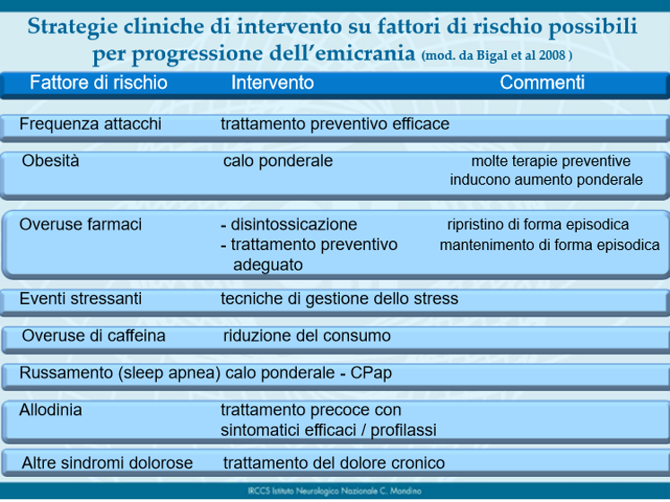 I principali sono i fattori scatenanti però protratti, l’abuso di sostanze, alcool, fumo e altro, l’abuso di farmaci, anche quelli per trattare la cefalea. Aggravanti sono poi anche le comorbidità frequentemente associate all’emicrania, per i cui dettagli si demanda al capitolo apposito.