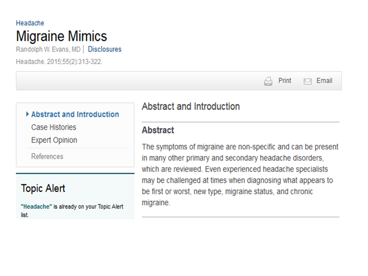 Pryse-Phillips WEM, Dodick DW, Edmeads JG, et al. Guidelines for the diagnosis and management of migraine in clinical practice. Can Med Assoc J. 1997;156(9):1273-1287.